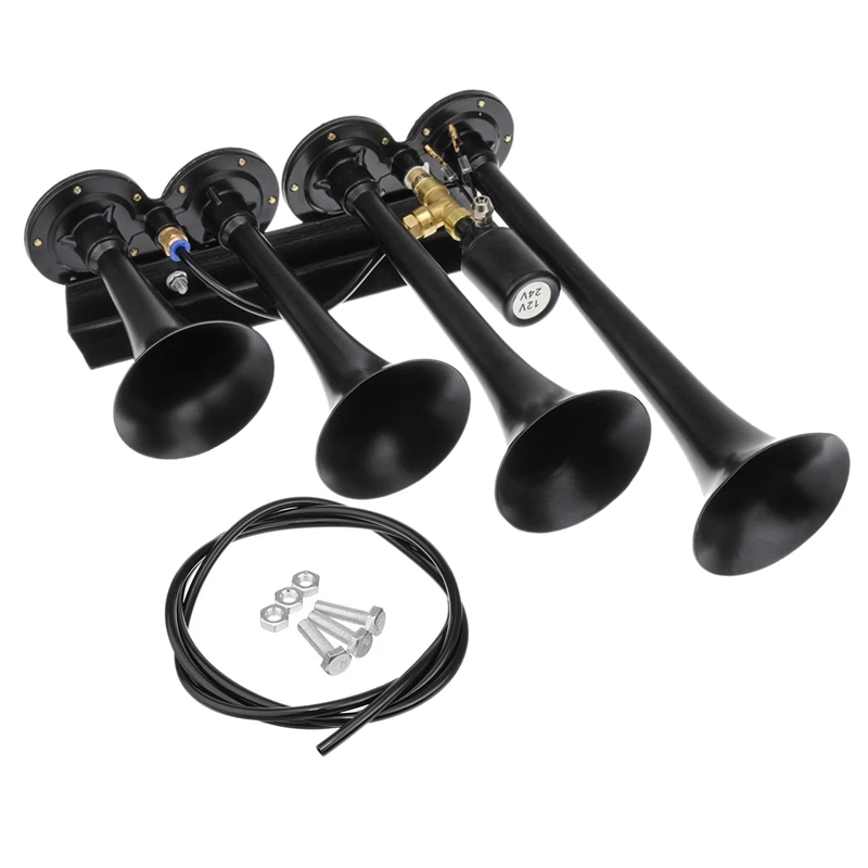 12V / 24V 185Db 4 / Four Super Trumpet Chrome Auto Car Air Horn Set For Car Vehicle Truck Train Boa